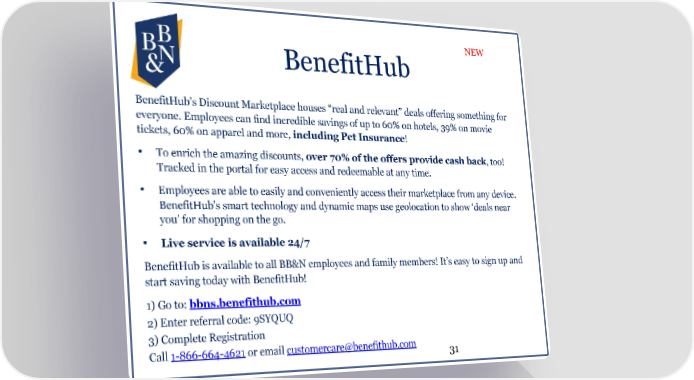BenefitHub NEW BenefitHub’sDiscount Marketplace houses “real and relevant” deals offering something for everyone. Employees can find incredible savings of up to 60% on hotels, 39% on movie tickets, 60% on apparel and more, including Pet Insurance! • To enrich the amazing discounts, over 70% of the offers provide cash back, too! Tracked in the portal for easy access and redeemable at any time. • Employees are able to easily and conveniently access their marketplace from any device. BenefitHub’ssmart technology and dynamic maps use geolocation to show ‘deals near you’ for shopping on the go. • Live service is available 24/7 BenefitHubis available to all BB&N employees and family members! It’s easy to sign up and start saving today with BenefitHub! 1) Go to: bbns.benefithub.com 2) Enter referral code: 9SYQUQ 3) Complete Registration Call 1-866-664-4621 or email [email protected] 31