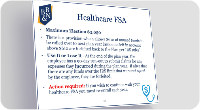 Healthcare FSA • Maximum Election $3,050 • There is a provision which allows $610 of unused funds to be rolled over to next plan year (amounts left in account above $610 are forfeited back to the Plan per IRS rules). • Use It or Lose It - At the end of the plan year, the employee has a 90-day run-out to submit claims for any expenses they incurredduring the plan year. If after that there are any funds over the IRS limit that were not spent by the employee, they are forfeited. • Action required:If you wish to continue with your healthcare FSA you must re-enroll each year. 26