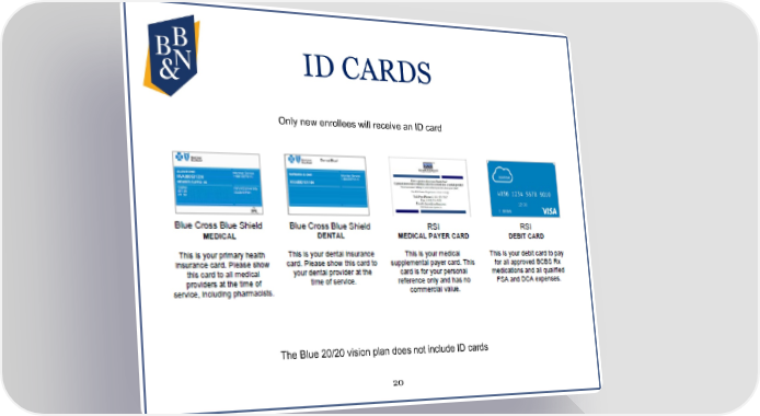 2023 Open Enrollment Presentation Page 19 Page 21ID CARDS Only new enrollees will receive an ID card The Blue 20/20 vision plan does not include ID cards 20