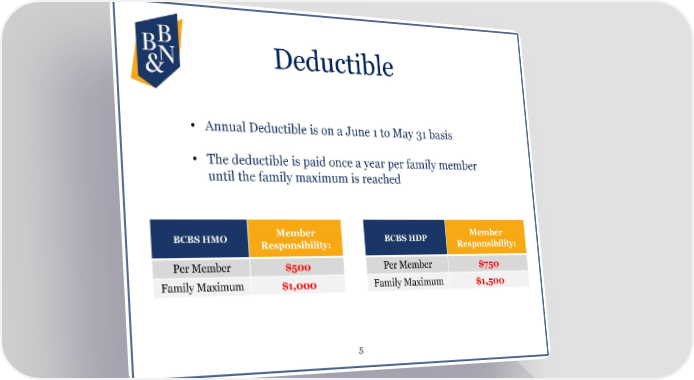 Deductible • Annual Deductible is on a June 1 to May 31 basis • The deductible is paid once a year per family member until the family maximum is reached BCBS HMO Member BCBS HDP Member Responsibility: Responsibility: Per Member $500 Per Member $750 Family Maximum $1,000 Family Maximum $1,500 5