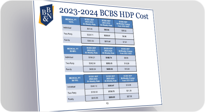 2023-2024 BCBS HDP Cost MEDICAL FT BCBS HDP BCBS HDP BCBS HDP 100% 2022-2023 2023-2024 Bi-Weekly Change Bi-Weekly Rate Bi-Weekly Rate from 2022-2023 Individual $61.46 $90.98 $29.52 Two-Party $228.71 $235.57 $6.86 Family $263.56 $271.47 $7.91 MEDICAL PT BCBS HDP BCBS HDP BCBS HDP 80-99% 2022-2023 2023-2024 Bi-Weekly Change Bi-Weekly Rate Bi-Weekly Rate from 2022-2023 Individual $184.21 $189.74 $5.53 Two-Party $342.84 $353.13 $10.29 Family $408.04 $420.28 $12.24 MEDICAL PT BCBS HDP BCBS HDP BCBS HDP 50-79% 2022-2023 2023-2024 Bi-Weekly Change Bi-Weekly Rate Bi-Weekly Rate from 2022-2023 Individual $345.12 $355.47 $10.35 Two-Party $709.50 $730.79 $21.29 Family $910.68 $938.00 $27.32 13