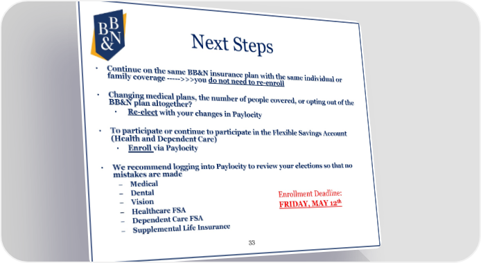 Next Steps • Continue on the same BB&N insurance plan with the same individual or family coverage ----->>>you do not need to re-enroll • Changing medical plans, the number of people covered, or opting out of the BB&N plan altogether? • Re-elect with your changes in Paylocity • To participate or continue to participate in the Flexible Savings Account (Health and Dependent Care) • Enroll via Paylocity • We recommend logging into Paylocity to review your elections so that no mistakes are made – Medical – Dental Enrollment Deadline: – Vision th – Healthcare FSA FRIDAY, MAY 12 – Dependent Care FSA – Supplemental Life Insurance 33