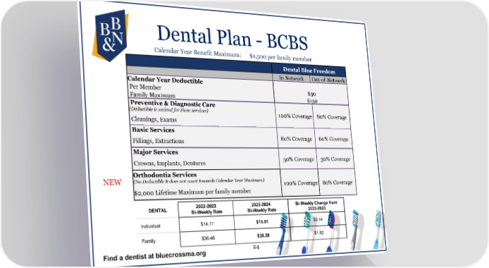 Dental Plan - BCBS Calendar Year Benefit Maximum: $1,500 per family member Dental Blue Freedom In Network Out-of-Network Calendar Year Deductible Per Member $50 Family Maximum $150 Preventive & Diagnostic Care (Deductible is waived for these services) 100% Coverage 80% Coverage Cleanings, Exams Basic Services Fillings, Extractions 80% Coverage 60% Coverage Major Services Crowns, Implants, Dentures 50% Coverage 30% Coverage Orthodontia Services NEW (No Deductible & does not count towards Calendar Year Maximum) 100% Coverage 80% Coverage $2,000 Lifetime Maximum per family member DENTAL 2022-2023 2023-2024 Bi-Weekly Change from Bi-Weekly Rate Bi-Weekly Rate 2022-2023 Individual $14.77 $15.51 $0.74 Family $36.46 $38.28 $1.82 Find a dentist at bluecrossma.org 24
