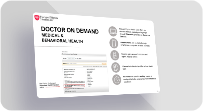 Harvard Pilgrim Health Care offers on- demand medical care at your fingertips DOCTOR ON DEMAND through Telehealth, provided by Doctor on MEDICAL & Demand BEHAVIORAL HEALTH Appointments can be made through smartphone, computer, or tablet 24/7/365 Receive quick access to doctors and expert medical advice Covers both Medical and Behavioral Health Care No more time spent in waiting rooms or costly visits to the emergency room for simple Find Doctor On Demand conditions Behavioral Health Providers online: [ 9 ]