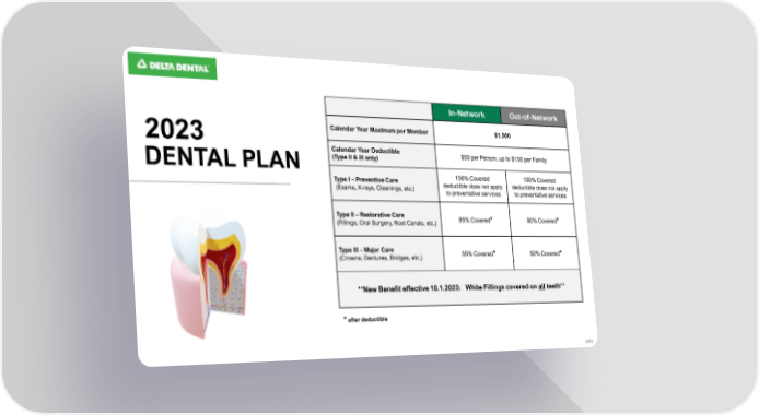 In-Network Out-of-Network 2023 Calendar Year Maximum per Member $1,500 Calendar Year Deductible $50 per Person, up to $150 per Family DENTAL PLAN (Type II & III only) Type I – Preventive Care 100% Covered 100% Covered (Exams, X-rays, Cleanings, etc.) deductible does not apply deductible does not apply to preventative services to preventative services Type II – Restorative Care 85% Covered (Fillings, Oral Surgery, Root Canals, etc.) * 80% Covered* Type III – Major Care 55% Covered* 50% Covered* (Crowns, Dentures, Bridges, etc.) **New Benefit effective 10.1.2023: White Fillings covered on all teeth** * after deductible [ 13 ]