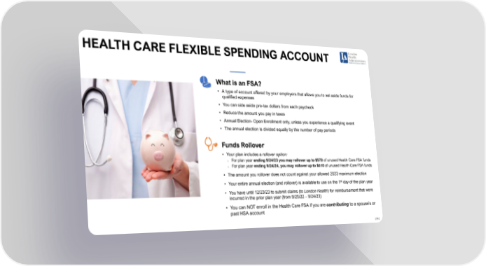HEALTH CARE FLEXIBLE SPENDING ACCOUNT What is an FSA? • A type of account offered by your employers that allows you to set aside funds for qualified expenses • You can side aside pre-tax dollars from each paycheck • Reduce the amount you pay in taxes • Annual Election- Open Enrollment only, unless you experience a qualifying event • The annual election is divided equally by the number of pay periods Funds Rollover • Your plan includes a rollover option: o For plan year ending 9/24/23 you may rollover up to $570 of unused Health Care FSA funds o For plan year ending 9/24/24, you may rollover up to $610 of unused Health Care FSA funds • The amount you rollover does not count against your allowed 2023 maximum election • Your entire annual election (and rollover) is available to use on the 1st day of the plan year • You have until 12/23/23 to submit claims (to London Health) for reimbursement that were incurred in the prior plan year (from 9/25/22 – 9/24/23) • You can NOT enroll in the Health Care FSA if you are contributing to a spouse’s or past HSA account [ 18 ]