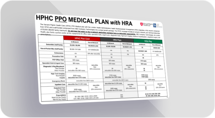 HPHC PPO MEDICAL PLAN with HRA The Harvard Pilgrim Health Care (HPHC) PPO Medical plan with the London Health Administrators Health Reimbursement Arrangement (HRA) integrates a fully insured component from HPHC and a self-funded component from ABC Company Technologies into a single benefit package. The HPHC coverage includes an annual in-network, per individual deductible services that apply to the in-network deductible members have no deductible responsibility. ABC Company Technologies, via London of $3,000 ($6,000 family maximum). On Health, also funds a portion and/or all the copayments for office visits, specialist visits, urgent care, diagnostic tests, high tech imaging, inpatient hospitalization, outpatient surgery and prescriptions. HPHC Plan Cost HRA Pays YOU Pay In-Network Out-of-Network In-Network Out-of-Network In-Network Out-of-Network Deductible (Ind/Family) $3,000 / $6,000 $6,000/$12,000 $3,000 / $6,000 $5,500/$11,100 $0 $500/$1,000 Out-of-Pocket Max (Ind/Family) $8,500 / $17,000 $17,000/$34,000 n/a n/a $8,500/$17,000 $17,000/$34,000 Coinsurance n/a 20% after deductible n/a 0% n/a 20% Preventive Visit $0 $0 $0 PCP Office Visit $40 copay $25 copay $15 copay Specialist Visit & Urgent Care $65 copay $25 copay $40 copay deductible deductible deductible Diagnostic X-Ray/Bloodwork then then then Flex Provider $0 20% coinsurance $0 20% coinsurance $0 20% coinsurance Other Provider deductible then $65 copay deductible then $65 copay $0 High Tech Imaging Non-Hospital $250 copay $125 copay $125 copay Hospital deductible then $750 copay deductible then $625 copay $125 copay Emergency Room deductible then $650 copay deductible then $525 copay $125 copay Inpatient Care deductible then $1,000 copay deductible then $1,000 copay $0 deductible deductible deductible Outpatient Care then then then Flex Provider $250 copay 20% coinsurance $250 copay 20% coinsurance $0 20% coinsurance Other Provider deductible then $750 copay deductible then $750 copay $0 Prescriptions Retail 30 Day Supply $5 / $30 / $80 / $120 / 20% to $500 50% $2.50 / $15 / $40 / $60 / 50% Mail 90 Day Supply $10 / $60 / $160 / $360 /20% to $1,500 50% $5 / $30 / $80 / $180 / 50% [ 8 ]