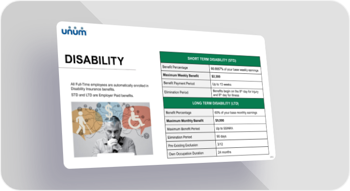 DISABILITY SHORT TERM DISABILITY (STD) Benefit Percentage 66.6667% of your base weekly earnings Maximum Weekly Benefit $2,300 Benefit Payment Period Up to 13 weeks All Full-Time employees are automatically enrolled in th Disability Insurance benefits. Elimination Period Benefits begin on the 8 day for injury th STD and LTD are Employer Paid benefits. and 8 day for illness LONG TERM DISABILITY (LTD) Benefit Percentage 60% of your base monthly earnings Maximum Monthly Benefit $9,000 Maximum Benefit Period Up to SSNRA Elimination Period 90 days Pre-Existing Exclusion 3/12 Own Occupation Duration 24 months [ 22 ]
