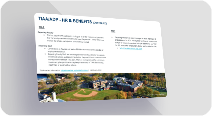 TIAA/ADP - HR & BENEFITS (CONTINUED) TIAA ADP Departing Faculty o Departing employees are encouraged to retain their login ID ○ The last day of TIAA participation is August 31 of the year worked, provided and password for ADP. Faculty/Staff continue to have access that the faculty member worked the full year (September - June). Otherwise, the last day of plan participation is the last day worked. to ADP to view and download both pay statements and W-2’s for 3-5 years after employment. Below are the links for ADP: Departing Staff ○ http://workforcenow.adp.com ○ Contributions to TIAA as well as the BB&N match cease on the last day of employment at BB&N. ○ Departing Faculty/Staff are encouraged to contact TIAA directly to evaluate investment options and determine whether they would like to continue to hold money under the BB&N TIAA plan. There is no requirement for a minimum investment; plan participants may keep their money in TIAA after leaving, indefinitely or explore other options. TIAA contact information: https://www.tiaa.org/public/tcm/bbn | 1-800-842-2252 2024-2025 Offboarding Guide | 6 5