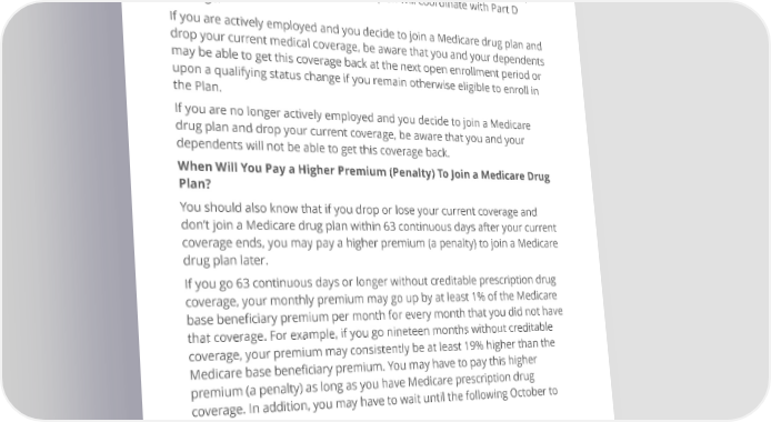 Your current coverage pays for other health expenses, in addition to prescription drugs. If you are actively employed and decide to join a Medicare drug plan, your current medical coverage will not be affected; you can keep this coverage if you elect part D and this plan will coordinate with Part D coverage. If you are actively employed and you decide to join a Medicare drug plan and drop your current medical coverage, be aware that you and your dependents may be able to get this coverage back at the next open enrollment period or upon a qualifying status change if you remain otherwise eligible to enroll in the Plan. If you are no longer actively employed and you decide to join a Medicare drug plan and drop your current coverage, be aware that you and your dependents will not be able to get this coverage back. When Will You Pay a Higher Premium (Penalty) To Join a Medicare Drug Plan? You should also know that if you drop or lose your current coverage and don’t join a Medicare drug plan within 63 continuous days after your current coverage ends, you may pay a higher premium (a penalty) to join a Medicare drug plan later. If you go 63 continuous days or longer without creditable prescription drug coverage, your monthly premium may go up by at least 1% of the Medicare base beneficiary premium per month for every month that you did not have that coverage. For example, if you go nineteen months without creditable coverage, your premium may consistently be at least 19% higher than the Medicare base beneficiary premium. You may have to pay this higher premium (a penalty) as long as you have Medicare prescription drug coverage. In addition, you may have to wait until the following October to join. For More Information About This Notice or Your Current Prescription Drug Coverage… Contact the plan administrator for further information. Page 10