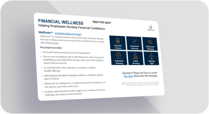 FINANCIAL WELLNESS *NEW FOR 2024!* Helping Employees Develop Financial Confidence TM : WellCents mywellcentsapp.com/login WellCentsTM is a financial wellness solution that helps employees develop financial confidence and remove barriers that prohibit them from reaching their financial goals. Personal Investment Retirement Theprogramprovides: Finance Planning Planning + Personal financial assessments and planning guidance + One-on-one consultations with an IMA Retirement advisor focused on establishing a personalized financial plan based upon the employee’s Protection Estate Retiring unique financial priorities Planning Planning Well + Coordinated advice that integrates an employer’s available benefits offerings Questions? Please feel free to contact + Tailored group education meetings to address a workforce’s specific Ben Stein, Retirement Plan Manager. areas of interest + Mobile appfor employees to complete assessments, schedule one-on- TM WellCents program technology is not proprietary to IMA Retirement. This technology is one sessions, and review action plans offered through the RPAG platform. RPAG and IMA Retirement are separate, non-affiliated companies. IMA Retirement pays RPAG for use of their platform and resources. + Employer reporting that provides insights into a workforce’s financial challenges and measures overall wellness