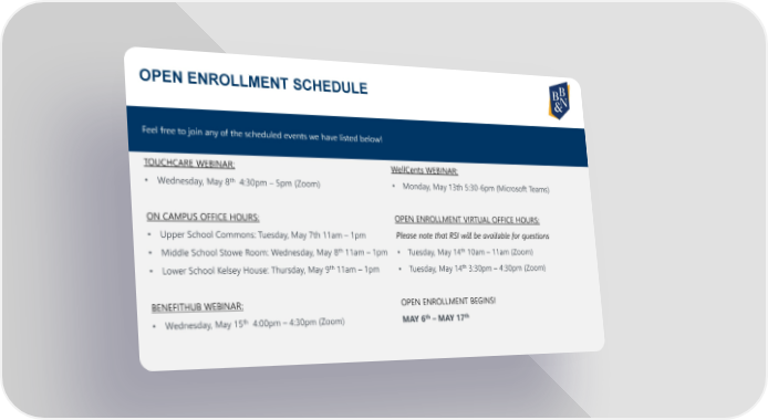 OPEN ENROLLMENT SCHEDULE Feel free to join any of the scheduled events we have listed below! TOUCHCARE WEBINAR: WellCents WEBINAR: th • Wednesday, May 8 4:30pm – 5pm (Zoom) • Monday, May 13th 5:30-6pm (Microsoft Teams) ON CAMPUS OFFICE HOURS: OPEN ENROLLMENT VIRTUAL OFFICE HOURS: • Upper School Commons: Tuesday, May 7th 11am – 1pm Please note that RSI will be available for questions th th • Middle School Stowe Room: Wednesday, May 8 11am – 1pm • Tuesday, May 14 10am – 11am (Zoom) th th • Lower School Kelsey House: Thursday, May 9 11am – 1pm • Tuesday, May 14 3:30pm – 4:30pm (Zoom) BENEFITHUB WEBINAR: OPEN ENROLLMENT BEGINS! th MAY 6th th • Wednesday, May 15 4:00pm – 4:30pm (Zoom) – MAY 17