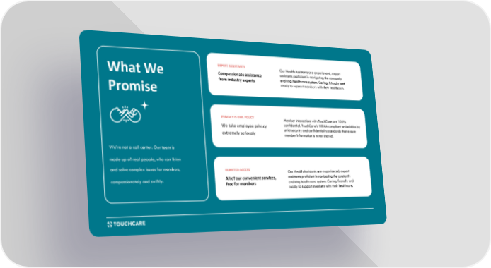 EXPERTASSISTANTS OurHealthAssistantsare experienced,expert WhatWe Compassionateassistance assistants proficient in navigating the constantly fromindustryexperts evolving health care system. Caring, friendly and Promise readyto supportmembers with their healthcare. PRIVACYISOURPOLICY Memberinteractions with TouchCareare 100% Wetakeemployeeprivacy confidential. TouchCare is HIPAA compliant and abides by extremely seriously strict security and confidentiality standards that ensure memberinformationis never shared. We’re not a call center. Our team is madeupofrealpeople,whocan listen and solve complex issues for members, ULIMITEDACCESS OurHealthAssistantsare experienced,expert compassionately and swiftly. All of our convenient services, assistants proficient in navigating the constantly free for members evolving health care system. Caring, friendly and readyto supportmembers with their healthcare.