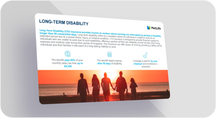 LONG-TERM DISABILITY Long-Term Disability (LTD) insurance provides income to workers whose earnings are interrupted by periods of disability longer than 90 consecutive days. Long-term disability refers to a condition where an individual is unable to work for an extended period due to a severe illness, injury, or medical condition. LTD insurance is designed to provide financial support to individuals who are unable to work due to such disabilities, offering a portion of their pre-disability income to help cover living expenses and medical costs during their period of incapacity. This insurance can offer peace of mind by providing a safety net for individuals and their families in the event of a long-lasting inability to work. This benefit pays 60% of your This benefit begins paying Coverage is paid for by your monthly salary tax-free up to after 90 days of disability employer and enrollment is $6,500 automatic