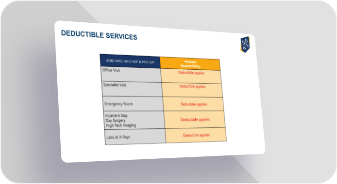 DEDUCTIBLE SERVICES BCBS HMO, HMO HDP & PPO HDP Member Responsibility: Office Visit Deductible applies Specialist Visit Deductible applies Emergency Room Deductible applies Inpatient Stay Day Surgery Deductible applies High Tech Imaging Labs & X-Rays Deductible applies