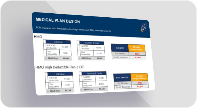 MEDICAL PLAN DESIGN BCBS Insurance with Participating Funding Arrangement (PFA) administered by RSI HMO Individual Two-Party & Family Full BCBS $4,500 Full BCBS $9,000 BCBS HMO Member Deductible Deductible Responsibility: - Your $500 - Your $1,000 Per Member $500 Deductible Deductible =BB&N Pays $4,000 = BB&N Pays $8,000 Family Maximum $1,000 HMO High Deductible Plan (HDP) Individual Two-Party & Family Full BCBS $4,500 Full BCBS $9,000 BCBS HMO HDP Member Deductible Deductible Responsibility: - Your $750 - Your $1,500 Per Member $750 Deductible Deductible =BB&N Pays $3,750 = BB&N Pays $7,500 Family Maximum $1,500