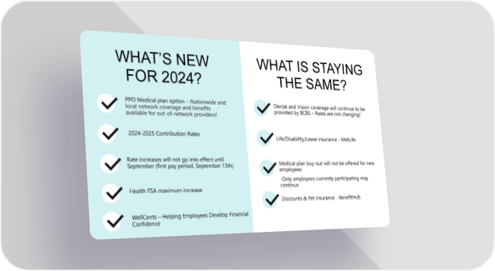 WHAT’S NEW WHAT IS STAYING FOR 2024? THE SAME? PPO Medical plan option – Nationwide and Dental and Vision coverage will continue to be local network coverage and benefits provided by BCBS – Rates are not changing! available for out-of-network providers! 2024-2025 Contribution Rates Life/Disability/Leave insurance - MetLife Rate increases will not go into effect until Medical plan buy-out will not be offered for new September (first pay period, September 13th) employees -Only employees currently participating may Health FSA maximum increase continue Discounts & Pet insurance - BenefitHub WellCents – Helping Employees Develop Financial Confidence