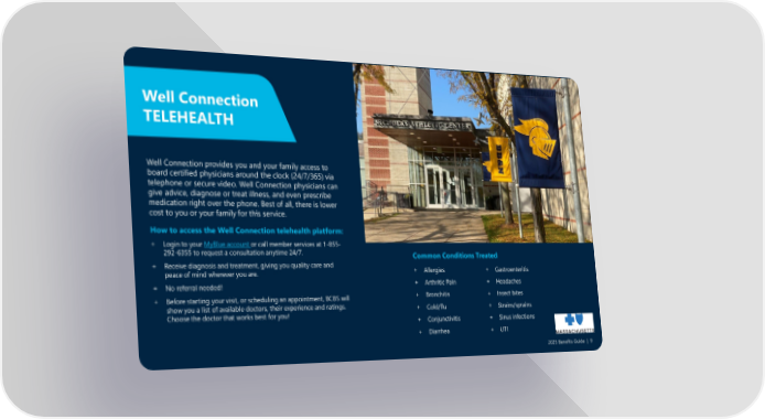 Well Connection provides you and your family access to board certified physicians around the clock (24/7/365) via telephone or secure video. Well Connection physicians can give advice, diagnose or treat illness, and even prescribe medication right over the phone. Best of all, there is lower cost to you or your family for this service. How to access the Well Connection telehealth platform: + Login to your MyBlue account or call member services at 1-855- 292-6355 to request a consultation anytime 24/7. + Receive diagnosis and treatment, giving you quality care and peace of mind wherever you are. + No referral needed! + Before starting your visit, or scheduling an appointment, BCBS will show you a list of available doctors, their experience and ratings. Choose the doctor that works best for you! Well Connection TELEHEALTH Common Conditions Treated + Allergies + Arthritic Pain + Bronchitis + Cold/flu + Conjunctivitis + Diarrhea + Gastroenteritis + Headaches + Insect bites + Strains/sprains + Sinus infections + UTI 2025 Benefits Guide | 9
