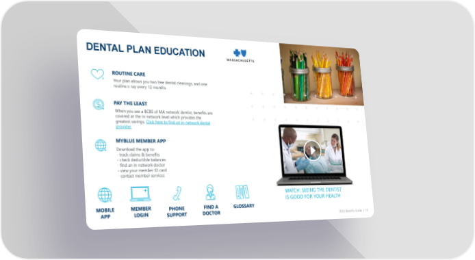 DENTAL PLAN EDUCATION When you see a BCBS of MA network dentist, benefits are covered at the in-network level which provides the greatest savings. Click here to find an in-network dental provider. PAY THE LEAST Download the app to: - track claims & benefits - check deductible balances - find an in-network doctor - view your member ID card - contact member services MYBLUE MEMBER APP Your plan allows you two free dental cleanings, and one routine x-ray every 12 months ROUTINE CARE 2025 Benefits Guide | 13 MEMBER LOGIN MEMBER LOGIN PHONE SUPPORT PHONE SUPPORT FIND A DOCTOR FIND A DOCTOR GLOSSARY GLOSSARY MOBILE APP MOBILE APP Icon Description automatically generated WATCH: SEEING THE DENTIST IS GOOD FOR YOUR HEALTH