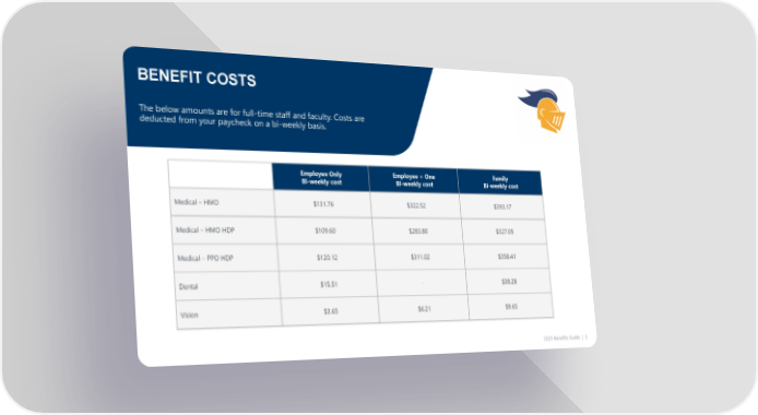BENEFIT COSTS The below amounts are for full-time staff and faculty. Costs are deducted from your paycheck on a bi-weekly basis. 2025 Benefits Guide | 2 Employee Only Bi-weekly cost Employee + One Bi-weekly cost Family Bi-weekly cost Medical – HMO $131.76 $322.52 $393.17 Medical – HMO HDP $109.60 $283.80 $327.05 Medical – PPO HDP $120.12 $311.02 $358.41 Dental $15.51 - $38.28 Vision $3.65 $6.21 $9.65