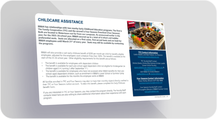 BB&N will also provide a cash early childcare benefit of $200 per month per child for benefits eligible employees, adjusted for the employee’s work schedule if less than 100%. This benefit is available at the start of the 25-26 school year. Other eligibility requirements for this benefit are as follows: • The benefit is available for employees with dependent children • The benefit is available for each pre-school aged dependent child not eligible for Kindergarten (ie children aged 0-4, turning 5 after September 1st ) • The benefit is available for employees who have not accessed other BB&N benefits for their pre- school aged dependent children, such as enrollment in BB&N’s Lower School or Summer Camp • The benefit is available for the months the employee works at BB&N All families enrolled in TFC and Four Seasons may elect to have their monthly stipend directly credited to their TFC or Four Seasons tuition account. To elect this benefit, please complete this Early Childcare Benefit Form. If you are interested in TFC or Four Seasons, you may contact the program directly. The Faculty/Staff contacts listed here are also willing to share additional information about their experience with each program. CHILDCARE ASSISTANCE 2025 Benefits Guide | 28 TFC Contact Information Caitlin Maddix and Kate Hudson, Co-Directors [email protected] TFC Faculty/Staff Contact Amena Zavery, Emma Arky Solomon & Kate Lavalle (Lower School Faculty) [email protected], [email protected] & [email protected] Josh Walker & Amelia Mattern [email protected] & [email protected] Four Seasons Contact Information Tracey Hanley, Director (617) 923-4848 [email protected] Four Seasons Faculty/Staff Contact Emma O’Loughlin (Director of BB&N Summer Camp) [email protected] BB&N has relationships with two nearby Early Childhood Education programs. The first is The Family Cooperative (TFC) and the second is Four Seasons Preschool (Four Seasons). Both are located in Watertown not far from our campuses. As announced earlier in the year, for the 2025-26 school year, BB&N secured up to a total of 6 infant and toddler preferential seats. Seats are allocated on a first come, first served basis and are held for BB&N employees until March 31st of every year. Seats may still be available by contacting the programs.
