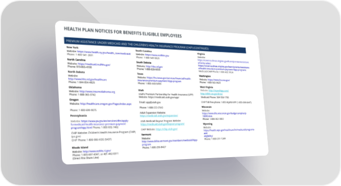 HEALTH PLAN NOTICES FOR BENEFITS ELIGIBLE EMPLOYEES PREMIUM ASSISTANCE UNDER MEDICAID AND THE CHILDREN’S HEALTH INSURANCE PROGRAM (CHIP) (CONTINUED) New York Website: https://www.health.ny.gov/health_care/medicaid/ Phone: 1-800-541-2831 North Carolina Website: https://medicaid.ncdhhs.gov/ Phone: 919-855-4100 North Dakota Website: http://www.hhs.nd.gov/healthcare Phone: 1-844-854-4825 Oklahoma Website: http://www.insureoklahoma.org Phone: 1-888-365-3742 Oregon Website: http://healthcare.oregon.gov/Pages/index.aspx Phone: 1-800-699-9075 Pennsylvania Website: https://www.pa.gov/en/services/dhs/apply- formedicaid-health-insurance-premium-payment- programhipp.html Phone: 1-800-692-7462 CHIP Website: Children's Health Insurance Program (CHIP) (pa.gov) CHIP Phone: 1-800-986-KIDS (5437) Rhode Island Website: http://www.eohhs.ri.gov/ Phone: 1-855-697-4347, or 401-462-0311 (Direct RIte Share Line) South Carolina Website: https://www.scdhhs.gov Phone: 1-888-549-0820 South Dakota Website: http://dss.sd.gov Phone: 1-888-828-0059 Texas Website: https://hs.texas.gov/services/financial/health- insurance-premium-payment-hipp-program Phone: 1-800-440-0493 Utah Utah’s Premium Partnership for Health Insurance (UPP) Website: https://medicaid.utah.gov/upp/ Email: upp@utah.gov Phone: 1-888-222-2542 Adult Expansion Website: https://medicaid.utah.gov/expansion/ Utah Medicaid Buyout Program Website: https://medicaid.utah.gov/buyout-program/ CHIP Website: https://chip.utah.gov/ Vermont Website: http://www.dvha.vermont.gov/members/medicaid/hipp- program Phone: 1-800-250-8427 Virginia Website: https://coverva.dmas.virginia.gov/learn/premiumassistanc e/famis-select https://coverva.dmas.virginia.gov/learn/premiumassistanc e/health-insurance-premium-payment-hipp-programs Medicaid/CHIP Phone: 1-800-432-5924 Washington Website: https://www.hca.wa.gov/ Phone: 1-800-562-3022 West Virginia Website: http://mywvhipp.com/ http://dhhr.wv.gov/bms/ Medicaid Phone: 304-558-1700 CHIP Toll-free phone: 1-855-MyWVHIPP (1-855-699-8447) Wisconsin Website: https://www.dhs.wisconsin.gov/badgercareplus/p- 10095.htm Phone: 1-800-362-3002 Wyoming Website: https://health.wyo.gov/healthcarefin/medicaid/programs- and eligibility/ Phone: 1-800-251-1269