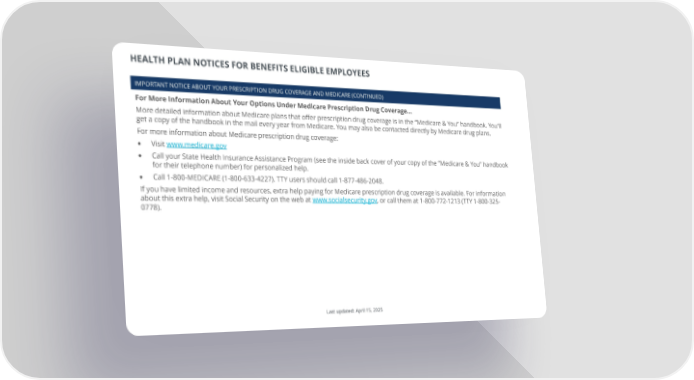 HEALTH PLAN NOTICES FOR BENEFITS ELIGIBLE EMPLOYEES IMPORTANT NOTICE ABOUT YOUR PRESCRIPTION DRUG COVERAGE AND MEDICARE (CONTINUED) For More Information About Your Options Under Medicare Prescription Drug Coverage… More detailed information about Medicare plans that offer prescription drug coverage is in the “Medicare & You” handbook. You’ll get a copy of the handbook in the mail every year from Medicare. You may also be contacted directly by Medicare drug plans. For more information about Medicare prescription drug coverage: • Visit www.medicare.gov • Call your State Health Insurance Assistance Program (see the inside back cover of your copy of the “Medicare & You” handbook for their telephone number) for personalized help. • Call 1-800-MEDICARE (1-800-633-4227). TTY users should call 1-877-486-2048. If you have limited income and resources, extra help paying for Medicare prescription drug coverage is available. For information about this extra help, visit Social Security on the web at www.socialsecurity.gov, or call them at 1-800-772-1213 (TTY 1-800-325- 0778). Last updated: April 15, 2025