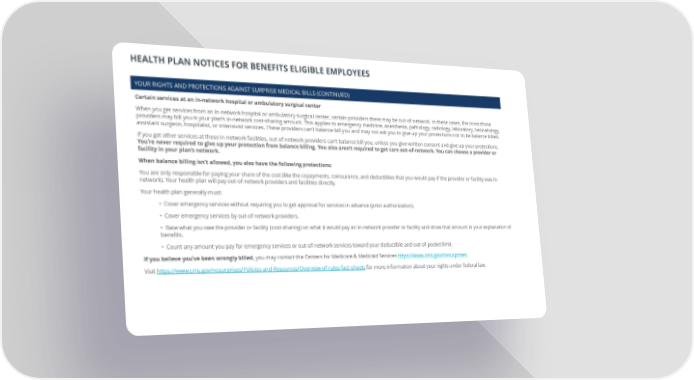 HEALTH PLAN NOTICES FOR BENEFITS ELIGIBLE EMPLOYEES YOUR RIGHTS AND PROTECTIONS AGAINST SURPRISE MEDICAL BILLS (CONTINUED) Certain services at an in-network hospital or ambulatory surgical center When you get services from an in-network hospital or ambulatory surgical center, certain providers there may be out-of-network. In these cases, the most those providers may bill you is your plan’s in-network cost-sharing amount. This applies to emergency medicine, anesthesia, pathology, radiology, laboratory, neonatology, assistant surgeon, hospitalist, or intensivist services. These providers can’t balance bill you and may not ask you to give up your protections not to be balance billed. If you get other services at these in-network facilities, out-of-network providers can’t balance bill you, unless you give written consent and give up your protections. You’re never required to give up your protection from balance billing. You also aren’t required to get care out-of-network. You can choose a provider or facility in your plan’s network. When balance billing isn’t allowed, you also have the following protections: You are only responsible for paying your share of the cost (like the copayments, coinsurance, and deductibles that you would pay if the provider or facility was in- network). Your health plan will pay out-of-network providers and facilities directly. Your health plan generally must: • Cover emergency services without requiring you to get approval for services in advance (prior authorization). • Cover emergency services by out-of-network providers. • Base what you owe the provider or facility (cost-sharing) on what it would pay an in-network provider or facility and show that amount in your explanation of benefits. • Count any amount you pay for emergency services or out-of-network services toward your deductible and out-of-pocket limit. If you believe you’ve been wrongly billed, you may contact the Centers for Medicare & Medicaid Services https://www.cms.gov/nosurprises. Visit https://www.cms.gov/nosurprises/Policies-and-Resources/Overview-of-rules-fact-sheets for more information about your rights under federal law.