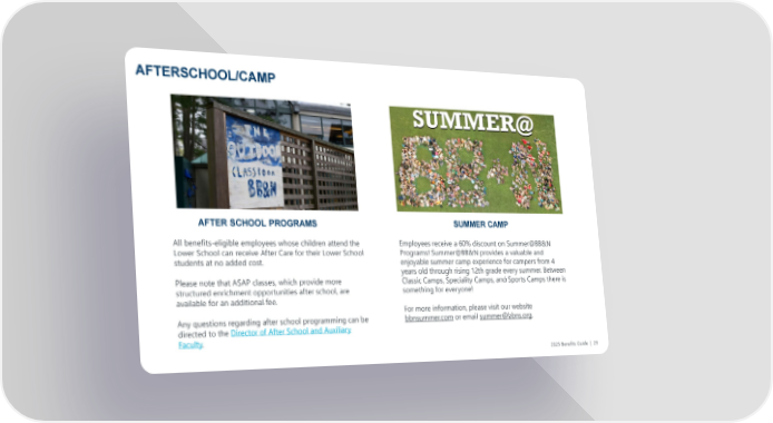 AFTER SCHOOL PROGRAMS All benefits-eligible employees whose children attend the Lower School can receive After Care for their Lower School students at no added cost. Please note that ASAP classes, which provide more structured enrichment opportunities after school, are available for an additional fee. Any questions regarding after school programming can be directed to the Director of After School and Auxiliary Faculty. SUMMER CAMP Employees receive a 60% discount on Summer@BB&N Programs! Summer@BB&N provides a valuable and enjoyable summer camp experience for campers from 4 years old through rising 12th grade every summer. Between Classic Camps, Speciality Camps, and Sports Camps there is something for everyone! For more information, please visit our website bbnsummer.com or email summer@bbns.org. AFTERSCHOOL/CAMP 2025 Benefits Guide | 29