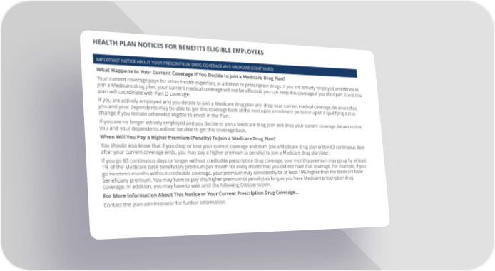 HEALTH PLAN NOTICES FOR BENEFITS ELIGIBLE EMPLOYEES IMPORTANT NOTICE ABOUT YOUR PRESCRIPTION DRUG COVERAGE AND MEDICARE (CONTINUED) What Happens to Your Current Coverage If You Decide to Join a Medicare Drug Plan? Your current coverage pays for other health expenses, in addition to prescription drugs. If you are actively employed and decide to join a Medicare drug plan, your current medical coverage will not be affected; you can keep this coverage if you elect part D and this plan will coordinate with Part D coverage. If you are actively employed and you decide to join a Medicare drug plan and drop your current medical coverage, be aware that you and your dependents may be able to get this coverage back at the next open enrollment period or upon a qualifying status change if you remain otherwise eligible to enroll in the Plan. If you are no longer actively employed and you decide to join a Medicare drug plan and drop your current coverage, be aware that you and your dependents will not be able to get this coverage back. When Will You Pay a Higher Premium (Penalty) To Join a Medicare Drug Plan? You should also know that if you drop or lose your current coverage and don’t join a Medicare drug plan within 63 continuous days after your current coverage ends, you may pay a higher premium (a penalty) to join a Medicare drug plan later. If you go 63 continuous days or longer without creditable prescription drug coverage, your monthly premium may go up by at least 1% of the Medicare base beneficiary premium per month for every month that you did not have that coverage. For example, if you go nineteen months without creditable coverage, your premium may consistently be at least 19% higher than the Medicare base beneficiary premium. You may have to pay this higher premium (a penalty) as long as you have Medicare prescription drug coverage. In addition, you may have to wait until the following October to join. For More Information About This Notice or Your Current Prescription Drug Coverage… Contact the plan administrator for further information.