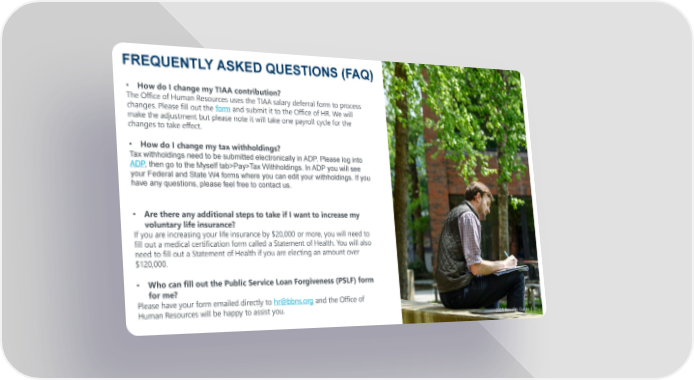 FREQUENTLY ASKED QUESTIONS (FAQ) 2025 Benefits Guide | 31 • How do I change my TIAA contribution? The Office of Human Resources uses the TIAA salary deferral form to process changes. Please fill out the form and submit it to the Office of HR. We will make the adjustment but please note it will take one payroll cycle for the changes to take effect. • How do I change my tax withholdings? Tax withholdings need to be submitted electronically in ADP. Please log into ADP, then go to the Myself tab>Pay>Tax Withholdings. In ADP you will see your Federal and State W4 forms where you can edit your withholdings. If you have any questions, please feel free to contact us. • Are there any additional steps to take if I want to increase my voluntary life insurance? If you are increasing your life insurance by $20,000 or more, you will need to fill out a medical certification form called a Statement of Health. You will also need to fill out a Statement of Health if you are electing an amount over $120,000. • Who can fill out the Public Service Loan Forgiveness (PSLF) form for me? Please have your form emailed directly to hr@bbns.org and the Office of Human Resources will be happy to assist you.