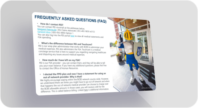 FREQUENTLY ASKED QUESTIONS (FAQ) 2025 Benefits Guide | 30 • How do I contact RSI? You can contact RSI via email at the addresses below. Margaret Patenaude | RSI Claims Advocate | 855-493-9859 x6153 General Inbox | 855-493-9859 Option 1 You can also log into the RSI portal here to view all medical statements and FSA spending. • What’s the difference between RSI and Touchcare? RSI is our wrap plan administrator that works with BCBS to administer your medical expenses. RSI also administers the FSA. Touchcare is a medical concierge service that is here to support you regarding navigating healthcare and disputing any issues around medical expenses. • How much do I have left on my FSA? RSI is our FSA provider - you can contact them, and they will be able to tell you your exact balance. If you have any additional questions, please feel free to contact the Office of Human Resources. • I elected the PPO plan and now I have a statement for using an out of network provider. Why is that? We highly encourage staying within the BCBS network county-wide. However, we understand there are times you might have to go out of network and when that happens the out of network medical provider can choose to charge over the BCBS allowable amount. In those cases, you will receive a bill for the difference. This is called balance billing. Linked here is additional information.