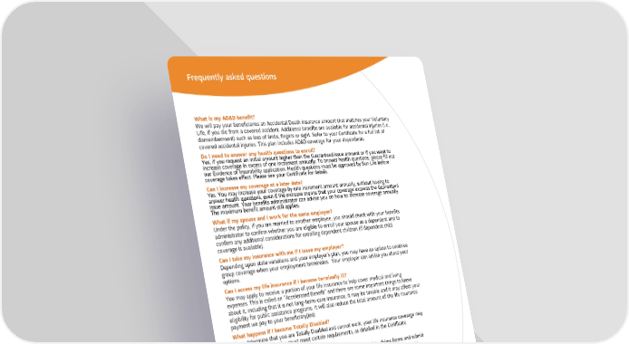 Frequently asked questions What is my AD&D benefit? We will pay your beneficiaries an Accidental Death insurance amount that matches your Voluntary Life, if you die from a covered accident. Additional benefits are available for accidental injuries (i.e., dismemberment) such as loss of limbs, fingers or sight. Refer to your Certificate for a full list of covered accidental injuries. This plan includes AD&D coverage for your dependents. Do I need to answer any health questions to enroll? Yes, if you request an initial amount higher than the Guaranteed Issue amount or if you want to increase coverage in excess of one increment annually. To answer health questions, please fill out our Evidence of Insurability application. Health questions must be approved by Sun Life before coverage takes effect. Please see your Certificate for details. Can I increase my coverage at a later date? Yes. You may increase your coverage by one increment amount annually, without having to answer health questions, even if the increase means that your coverage exceeds the Guaranteed Issue amount. Your benefits administrator can advise you on how to increase coverage annually. The maximum benefit amount still applies. What if my spouse and I work for the same employer? Under the policy, if you are married to another employee, you should check with your benefits administrator to confirm whether you are eligible to enroll your spouse as a dependent and to confirm any additional considerations for enrolling dependent children (if dependent child coverage is available). Can I take my insurance with me if I leave my employer? Depending upon state variations and your employer’s plan, you may have an option to continue group coverage when your employment terminates. Your employer can advise you about your options. Can I access my life insurance if I become terminally ill? You may apply to receive a portion of your life insurance to help cover medical and living expenses. This is called an “Accelerated Benefit” and there are some important things to know about it, including that it is not long-term-care insurance, it may be taxable and it may affect your eligibility for public assistance programs. It will also reduce the total amount of the life insurance payment we pay to your beneficiary(ies). What happens if I become Totally Disabled? If we determine that you are Totally Disabled and cannot work, your life insurance coverage may continue at no cost. You must meet certain requirements, as detailed in the Certificate. How does my beneficiary file a death claim? Your beneficiary(ies) and your employer will complete the appropriate claims forms and submit them to us. We will notify your beneficiaries when the decision is made and if we have any questions. If approved, beneficiaries may elect to receive a lump sum payment or to have the benefit paid into an account where the funds accumulate interest and can be withdrawn at any time. (State restrictions apply and options may vary by state.) If your AD&D claim for an accidental Read the Important information section for more details including limitations and exclusions. 800-247-6875 • sunlife.com/us Voluntary Life Insurance