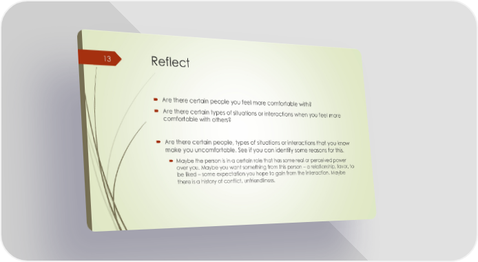 Reflect Are there certain people you feel more comfortable with? Are there certain types of situations or interactions when you feel more comfortable with others? Are there certain people, types of situations or interactions that you know make you uncomfortable. See if you can identify some reasons for this. Maybe the person is in a certain role that has some real or perceived power over you. Maybe you want something from this person – a relationship, favor, to be liked – some expectation you hope to gain from the interaction. Maybe there is a history of conflict, unfriendliness. 13