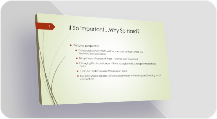If So Important…Why So Hard? Personal perspective Connections often tied to various roles and settings (where we live/work/learn/socialize) Disruptions or changes in these – wanted and unwanted Changing life circumstances – illness, caregiver role, changes in relationship status It can be harder to make friends as an adult Our own unique patterns, skills and experiences with making and keeping social connections 7