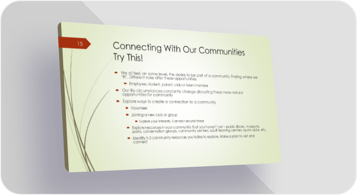 Connecting With Our Communities Try This! We all feel, on some level, the desire to be part of a community, finding where we ‘fit’. Different roles offer these opportunities Employee, student, parent, club or team member Our life circumstances constantly change disrupting these more natural opportunities for community Explore ways to create a connection to a community Volunteer Joining a new club or group Explore your interests. Connect around these Explore resources in your community that you haven’t yet – public library, museums, parks, conservation groups, community centers, adult learning centers, sports clubs, etc. Identify 1-3 community resources you’d like to explore. Make a plan to visit and connect 15