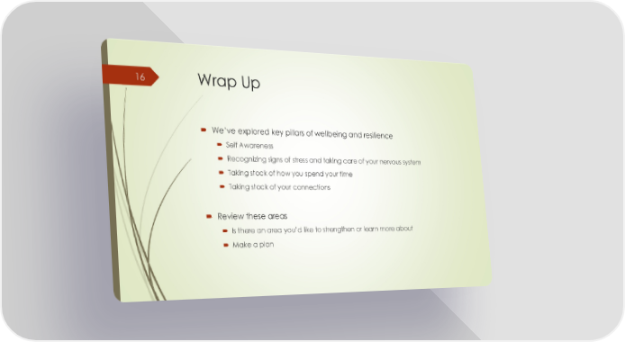 Wrap Up We’ve explored key pillars of wellbeing and resilience Self Awareness Recognizing signs of stress and taking care of your nervous system Taking stock of how you spend your time Taking stock of your connections Review these areas Is there an area you’d like to strengthen or learn more about Make a plan 16