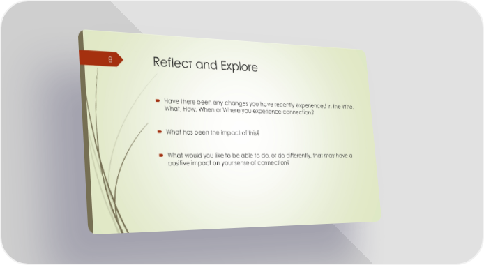 Reflect and Explore Have there been any changes you have recently experienced in the Who, What, How, When or Where you experience connection? What has been the impact of this? What would you like to be able to do, or do differently, that may have a positive impact on your sense of connection? 8