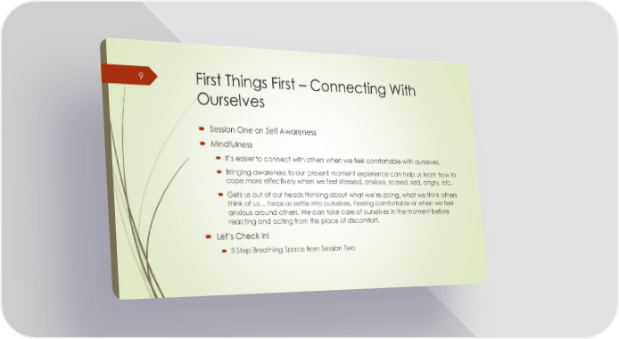 First Things First – Connecting With Ourselves Session One on Self Awareness Mindfulness It’s easier to connect with others when we feel comfortable with ourselves. Bringing awareness to our present moment experience can help us learn how to cope more effectively when we feel stressed, anxious, scared, sad, angry, etc. Gets us out of our heads thinking about what we’re doing, what we think others think of us… helps us settle into ourselves. Feeling comfortable or when we feel anxious around others. We can take care of ourselves in the moment before reacting and acting from this place of discomfort. Let’s Check In! 3 Step Breathing Space from Session Two 9