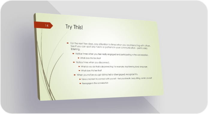Try This! For the next few days, pay attention to times when you are interacting with others. See if you can spot any habits or patterns in your communication – particularly listening. Notice times when you feel really engaged and participating in the conversation. What does this feel like? Notice times when you disconnect. What do you do that is disconnecting. For example, stop listening, body language. What does this feel like? When you notice you got distracted or disengaged, recognize this. Take a moment to connect with yourself – feel your breath, body sitting, center yourself Reengage in the conversation 14