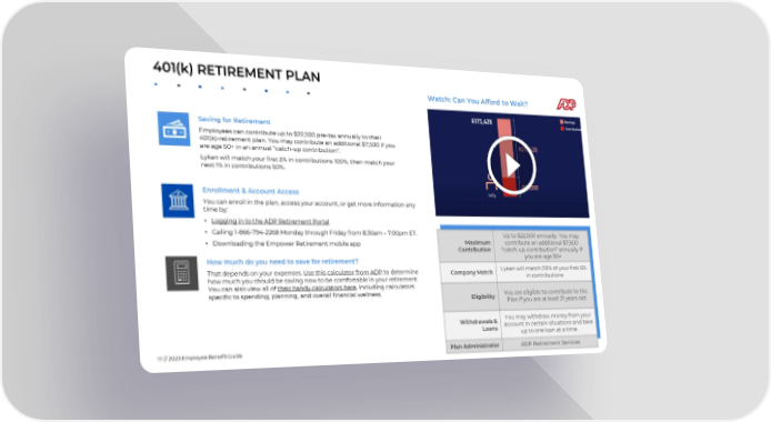 401(k) RETIREMENT PLAN Watch: Can You Afford to Wait? Saving for Retirement Employees can contribute up to $22,500 pre-tax annually to their 401(k)-retirement plan. You may contribute an additional $7,500 if you are age 50+ in an annual "catch-up contribution". ABC will match your first 3% in contributions 100%, then match your next 1% in contributions 50%. Enrollment & Account Access You can enroll in the plan, access your account, or get more information any time by: • Logging in to the ADP Retirement Portal • Calling 1-866-794-2268 Monday through Friday from 8:30am –7:00pm ET. Up to $22,500 annually. You may • Downloading the Empower Retirement mobile app Maximum contribute an additional $7,500 Contribution “catch-up contribution” annually if How much do you need to save for retirement? you are age 50+ That depends on your expenses. Use this calculator from ADP to determine Company Match ABC will match 50% of your first 6% in how much you should be saving now to be comfortable in your retirement. contributions their handy calculators here, including calculators You can also view all of specific to spending, planning, and overall financial wellness. Eligibility You are eligible to contribute to the Plan if you are at least 21 years old Withdrawals & You may withdraw money from your Loans account in certain situations and take up to one loan at a time. 17// 2023 Employee BenefitGuide Plan Administrator ADP Retirement Services