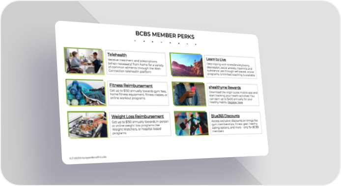 BCBS MEMBER PERKS Telehealth Learn to Live Receive treatment and prescriptions Help coping with stress/anxiety/worry, (when necessary) from home for a variety depression, social anxiety, insomnia and of common ailments through the Well- substance use through self-paced, online Connection telehealth platform programs. Unlimited coaching is available Fitness Reimbursement ahealthyme Rewards Get up to $150 annually towards gym fees, Download the virgin pulse mobile app and home fitness equipment, fitness classes, or start tracking your health activities! You online workout programs can earn up to $400 annually for your healthy habits. Register here Weight Loss Reimbursement Blue365 Discounts Get up to $150 annually towards in-person Access exclusive discounts on things like or online weight loss programs like gym memberships, fitness gear, healthy Weight Watchers, or hospital-based eating options, and more – only for BCBS programs members 6// 2023 Employee BenefitGuide