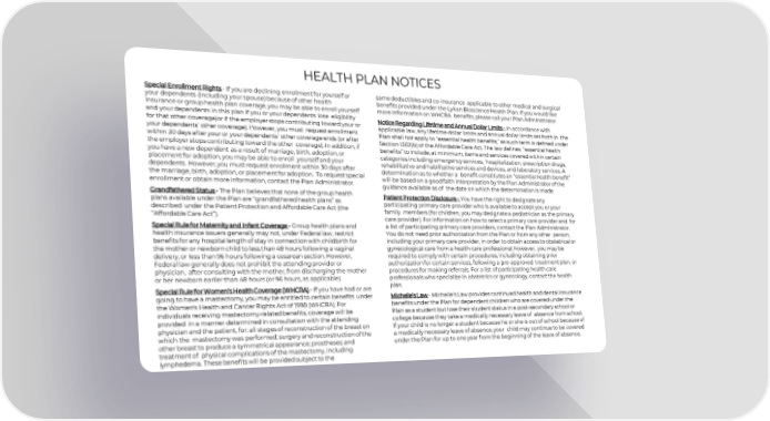 HEALTH PLAN NOTICES Special Enrollment Rights - If you are declining enrollment for yourself or same deductibles and co-insurance applicable to other medical and surgical your dependents (including your spouse) because of other health benefits provided under the ABC Company Health Plan. If you would like more insurance or group health plan coverage, you may be able to enroll yourself information on WHCRA benefits, please call your Plan Administrator and your dependents in this plan if you or your dependents lose eligibility Notice Regarding Lifetime and Annual Dollar Limits - In accordance with for that other coverage(or if the employer stops contributing toward your or applicable law, any lifetime dollar limits and annual dollar limits set forth in the your dependents’ other coverage). However, you must request enrollment Plan shall not apply to “essential health benefits,” as such term is defined under within 30 days after your or your dependents’ other coverage ends (or after Section 1302(b) of the Affordable Care Act. The law defines “essential health the employer stops contributing toward the other coverage). In addition, if benefits” to include, at minimum, items and services covered within certain you have a new dependent as a result of marriage, birth, adoption, or categories including emergency services, hospitalization, prescription drugs, placement for adoption, you may be able to enroll yourself and your rehabilitative and habilitative services and devices, and laboratory services. A dependents. However, you must request enrollment within 30 days after determination as to whether a benefit constitutes an “essential health benefit” the marriage, birth, adoption, or placement for adoption. To request special will be based on a good faith interpretation by the Plan Administrator of the enrollment or obtain more information, contact the Plan Administrator. guidance available as of the date on which the determination is made. Grandfathered Status -The Plan believes that none of the group health Patient Protection Disclosure - You have the right to designate any plans available under the Plan are “grandfathered health plans” as participating primary care provider who is available to accept you or your described under the Patient Protection and Affordable Care Act (the family members (for children, you may designate a pediatrician as the primary “Affordable Care Act”). care provider). For information on how to select a primary care provider and for Special Rule for Maternity and Infant Coverage -Group health plans and a list of participating primary care providers, contact the Plan Administrator. health insurance issuers generally may not, under Federal law, restrict You do not need prior authorization from the Plan or from any other person, benefits for any hospital length of stay in connection with childbirth for including your primary care provider, in order to obtain access to obstetrical or the mother or newborn child to less than 48 hours following a vaginal gynecological care from a health care professional; however, you may be delivery, or less than 96 hours following a cesarean section. However, required to comply with certain procedures, including obtaining prior Federal law generally does not prohibit the attending provider or authorization for certain services, following a pre-approved treatment plan, or physician, after consulting with the mother, from discharging the mother procedures for making referrals. For a list of participating health care or her newborn earlier than 48 hours (or 96 hours, as applicable). professionals who specialize in obstetrics or gynecology, contact the health Special Rule for Women’s Health Coverage (WHCRA) -If you have had or are plan. going to have a mastectomy, you may be entitled to certain benefits under Michelle’s Law - Michelle’s Law provides continued health and dental insurance the Women's Health and Cancer Rights Act of 1998 (WHCRA). For benefits under the Plan for dependent children who are covered under the individuals receiving mastectomy-related benefits, coverage will be Plan as a student but lose their student status in a post-secondary school or provided in a manner determined in consultation with the attending college because they take a medically necessary leave of absence from school. physician and the patient, for: all stages of reconstruction of the breast on If your child is no longer a student because he or she is out of school because of which the mastectomy was performed; surgery and reconstruction of the a medically necessary leave of absence, your child may continue to be covered other breast to produce a symmetrical appearance; prostheses; and under the Plan for up to one year from the beginning of the leave of absence. treatment of physical complications of the mastectomy, including lymphedema. These benefits will be provided subject to the