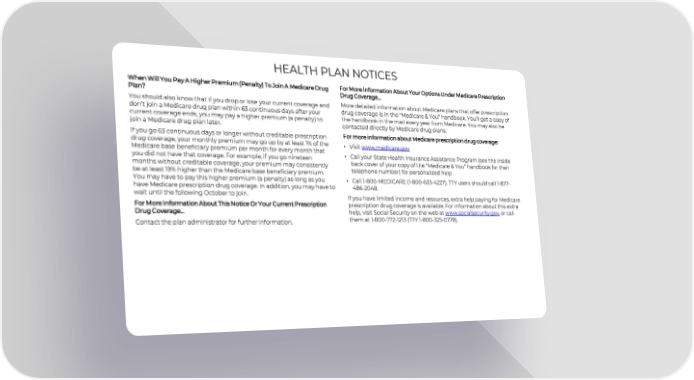 HEALTH PLAN NOTICES When Will You Pay A Higher Premium (Penalty) To Join A Medicare Drug For More Information About Your Options Under Medicare Prescription Plan? Drug Coverage… You should also know that if you drop or lose your current coverage and More detailed information about Medicare plans that offer prescription don’t join a Medicare drug plan within 63 continuous days after your drug coverage is in the “Medicare & You” handbook. You’ll get a copy of current coverage ends, you may pay a higher premium (a penalty) to the handbook in the mail every year from Medicare. You may also be join a Medicare drug plan later. contacted directly by Medicare drug plans. If you go 63 continuous days or longer without creditable prescription For more information about Medicare prescription drug coverage: drug coverage, your monthly premium may go up by at least 1% of the • Visit www.medicare.gov Medicare base beneficiary premium per month for every month that • Call your State Health Insurance Assistance Program (see the inside you did not have that coverage. For example, if you go nineteen back cover of your copy of the “Medicare & You” handbook for their months without creditable coverage, your premium may consistently telephone number) for personalized help be at least 19% higher than the Medicare base beneficiary premium. You may have to pay this higher premium (a penalty) as long as you • Call 1-800-MEDICARE (1-800-633-4227). TTY users should call 1-877- have Medicare prescription drug coverage. In addition, you may have to 486-2048. wait until the following October to join. If you have limited income and resources, extra help paying for Medicare For More Information About This Notice Or Your Current Prescription prescription drug coverage is available. For information about this extra Drug Coverage… help, visit Social Security on the web at www.socialsecurity.gov, or call Contact the plan administrator for further information. them at 1-800-772-1213 (TTY 1-800-325-0778).