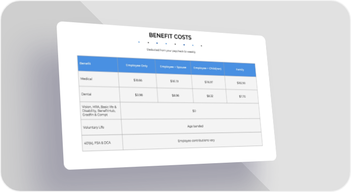 BENEFIT COSTS Deducted from your paycheck bi-weekly Benefit Employee Only Employee + Spouse Employee + Child(ren) Family Medical $18.66 $161.19 $116.97 $182.90 Dental $0.98 $8.98 $8.32 $11.70 Vision, HRA, Basic life & Disability, BenefitHub, $0 Gradfin & Compt Voluntary Life Age banded 401(k), FSA & DCA Employee contributions vary