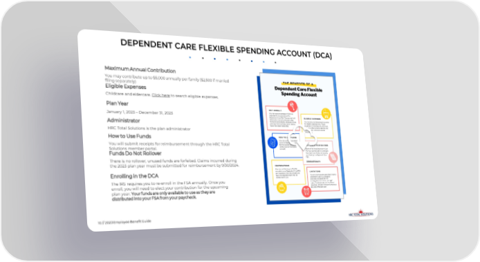 DEPENDENT CARE FLEXIBLE SPENDING ACCOUNT (DCA) MaximumAnnual Contribution You may contribute up to $5,000 annually per family ($2,500 if married filing separately) Eligible Expenses Childcare andeldercare. Click here to search eligible expenses. PlanYear January 1, 2023 – December 31, 2023 Administrator HRC Total Solutions is the plan administrator How to UseFunds You will submit receipts for reimbursement through the HRC Total Solutions memberportal. FundsDo NotRollover There is no rollover; unused funds are forfeited. Claims incurred during the 2023 plan year must be submitted for reimbursement by 9/30/2024. Enrolling in the DCA The IRS requires you to re-enroll in the FSA annually. Once you enroll, you will need to elect your contribution for the upcoming Your funds are only available to use as they are plan year. distributed into your FSA from your paycheck. 10// 2023 Employee BenefitGuide