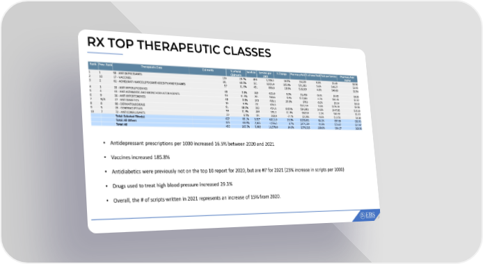 RX TOP THERAPEUTIC CLASSES Rank Prev. Rank Therapeutic Class Claimants % of total Services Services per % Change Pharmacy Paid % of total Paid Paid per Service Pharmacy Paid Claimants 1000 PMPM 1 1 58 - ANTIDEPRESSANTS 126 25.7% 893 1,720.3 16.5% $3,120 0.8% $3.49 $0.50 2 10 17 - VACCINES 311 63.5% 531 1,023.0 185.8% $21,385 5.6% $40.27 $3.43 3 2 61 - ADHD/ANTI-NARCOLEPSY/ANTI-OBESITY/ANOREXIANTS 57 11.6% 451 868.8 28.6% $18,309 4.8% $40.60 $2.94 4 3 39 - ANTIHYPERLIPIDEMICS 48 9.8% 313 603.0 8.9% $1,456 0.4% $4.65 $0.23 5 4 44 - ANTIASTHMATIC AND BRONCHODILATOR AGENTS 58 11.8% 291 560.6 5.4% $17,884 4.7% $61.46 $2.87 6 9 36 - ANTIHYPERTENSIVES 48 9.8% 243 468.1 29.3% $763 0.2% $3.14 $0.12 7 N/A 27 - ANTIDIABETICS 16 3.3% 211 406.5 $37,219 9.8% $176.39 $5.98 8 8 90 - DERMATOLOGICALS 91 18.6% 210 404.6 8.8%% $94,048 24.8% $447.85 $15.10 9 5 25 - CONTRACEPTIVES 58 11.8% 203 391.1 -11.9% $8,510 2.2% $41.92 $1.37 10 7 72 - ANTICONVULSANTS 32 6.5% 191 368.0 -2.1% $2,396 0.6% $12.55 $0.38 Total: Selected Filter(s) 422 86.1% 3,537 6,813.9 23.3% $205,091 54.1% $57.98 $32.93 Total: All Others 335 68.4% 2,365 4,556.1 3.7% $174,234 45.9% $73.67 $27.97 Total: All 490 100.0% 5,902 11,370.0 14.6% $379,325 100.0% $64.27 $60.90 • Antidepressant prescriptions per 1000 increased 16.5% between 2020 and 2021 • Vaccines increased 185.8% • Antidiabetics were previously not on the top 10 report for 2020, but are #7 for 2021 (23% increase in scripts per 1000) • Drugs used to treat high blood pressure increased 29.3% • Overall, the # of scripts written in 2021 represents an increase of 15% from 2020. [ 10 ] [ 10