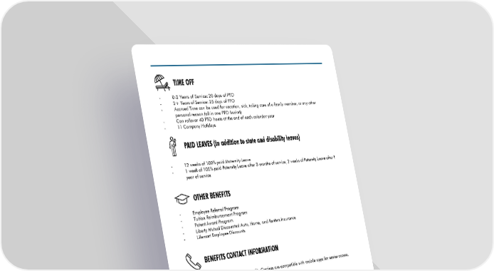 TIME OFF - 0-2 Years of Service: 20 days of PTO - 2+ Years of Service: 25 days of PTO - Accrued Time can be used for vacation, sick, taking care of a family member, or any other personal reason (all in one PTO bucket) - Can rollover 40 PTO hours at the end of each calendar year - 11 Company Holidays PAID LEAVES (in addition to state and disability leaves) - 12 weeks of 100% paid Maternity Leave - 1 week of 100% paid Paternity Leave after 3 months of service, 2 weeks of Paternity Leave after 1 year of service OTHER BENEFITS - Employee Referral Program - Tuition Reimbursement Program - Patent Award Program - Liberty Mutual Discounted Auto, Home, and Renters Insurance - Lifemart Employee Discounts BENEFITS CONTACT INFORMATION Benefits Contact Information: All Benefits Carriers are compatible with mobile apps for easier access. BCBS Medical & Dental: 1-800-358-2227 Kaiser Permanente: 1-833-574-2273 Eye Med: 1-844-225-3107 Fidelity: 1-800-587-5282 Benefit Resource Inc: 1-800-473-9595 2022 BENEFIT SUMMARY