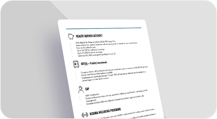 HEALTH SAVINGS ACCOUNT - Only eligible for those enrolled in BCBS PPO Saver Plan - Reserve funds for medical expenses without paying taxes or interest on your contributions - Runs on the calendar year - Up to $3,700 for individual coverage - Up to $7,300 for family coverage - Additional $1,000 coverage for participants over 55 401(k) – Fidelity Investments - Company Match: 50% of the first 6% of your contribution up to a maximum of $5,000.00 per year - Pre-tax and Post-tax Roth options available - Employees can contribute between 1% and 100% of their salary; deferrals can be elected as a percentage or a fixed dollar amount EAP - 100% Confidential - Guidance Resources helps with any issue that is affecting overall health, well-being and life management - Examples include: child care referrals, financial consultation, legal consultation, etc. BCBSMA WELLBEING PROGRAMS - BCBS AHealthyMe Rewards: earn up to $400 in cash rewards for making smart, healthy choices each day - Fitness Reimbursement: get reimbursed for 3 consecutive months of monthly membership fees or up to 10 fitness classes up to $150 - Weight Loss Reimbursement: get reimbursed for 3 consecutive months of monthly membership fees for designated programs - BCBS Emotional Health & Wellbeing Resources KAISER WELLBEING PROGRAMS - Class Pass: employees have access to unlimited on-demand video workouts at no cost and reduced rates on livestream and in-person classes - Calm: have access to the Daily Calm, more than 100 guided meditations, sleep stories to soothe into a deeper and better sleep, and video lessons on mindful movement and gentle stretching 2022 BENEFIT SUMMARY