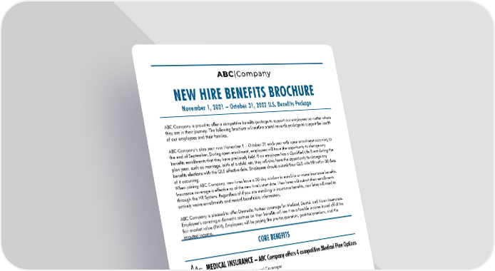 NEW HIRE BENEFITS BROCHURE November 1, 2021 – October 31, 2022 U.S. Benefits Package ABC Company is proud to offer a competitive benefits package to support our employees no matter where they are in their journey. The following brochure will outline a total rewards package to support the health of our employees and their families. ABC Company’s plan year runs November 1 – October 31 each year with open enrollment occurring at the end of September. During open enrollment, employees will have the opportunity to change any benefits enrollments that they have previously held. If an employee has a Qualified Life Event during the plan year, such as marriage, birth of a child, etc, they will also have the opportunity to change any benefits elections with the QLE effective date. Employees should submit their QLE with HR within 30 days of it occurring. When joining ABC Company, new hires have a 30 day window to enroll in or waive insurance benefits. Insurance coverage is effective as of the new hire’s start date. New hires will submit their enrollments through the HR System. Regardless of if you are enrolling in insurance benefits, new hires will need to actively waive enrollments and record beneficiary information. ABC Company is pleased to offer Domestic Partner coverage for Medical, Dental, and Vision Insurance. Employee’s covering a domestic partner on their benefits will see it as a taxable income based off of the fair market value (FMV). Employees will be paying the pre-tax premium, post-tax premium, and the imputed income. CORE BENEFITS MEDICAL INSURANCE – ABC Company offers 4 competitive Medical Plan Options Blue Cross Blue Shield MA Plans – National Coverage: Blue Cross Blue Shield HMO Blue New England - In Network Only - New England Only - Referral required for specialty visits - $500 deductible for individual coverage; $1,000 deductible for family and employee +1 coverage Blue Cross Blue Shield PPO - In network and out of network coverage - $500 deductible for individual coverage; $1,000 deductible for family and employee +1 coverage - Copays (no deductible) for office visits, prescriptions, & emergency room Blue Cross Blue Shield PPO Saver - In network and out of network coverage - Lowest monthly payments for employees - Health Savings Account Compatible! - $1,500 deductible for individual coverage; $3,000 deductible for family and employee +1 coverage Kaiser Permanente - California Only 2022 BENEFIT SUMMARY